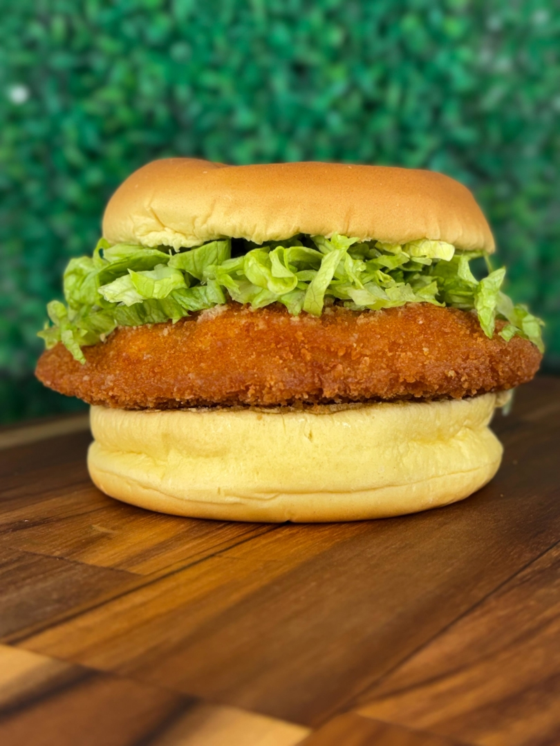 Pão macio, saborosa maionese verde, peito de frango empanado no molho secreto do Pai, queijo cheddar fatiado e alface. - acompanha molho (Alérgicos - Contém leves traços de mel)