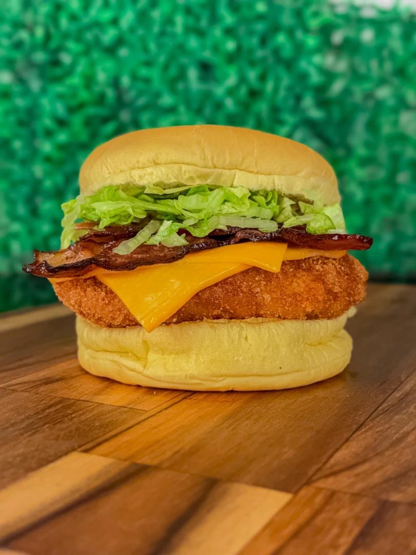 Pão macio, saborosa maionese verde, peito de frango empanado no molho secreto do Pai, queijo cheddar fatiado e alface. - acompanha molho (Alérgicos - Contém leves traços de mel)